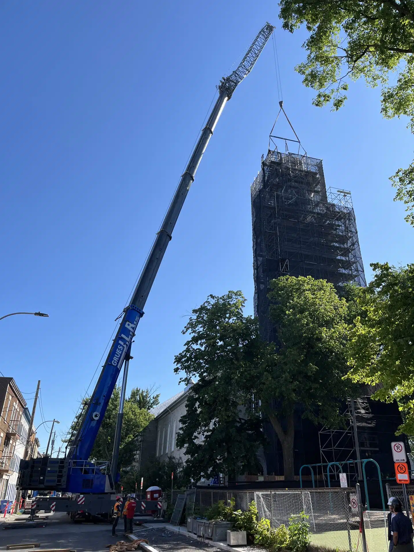 Nous sommes ravis de pouvoir contribuer à la réfection de l’église Saint-Sauveur. Notre équipe procède à la mise en place d’accès en échafaudage pour que les travailleurs puissent se rendre jusqu’au clocher. Un très beau projet de restauration d’un bâtiment du patrimoine.